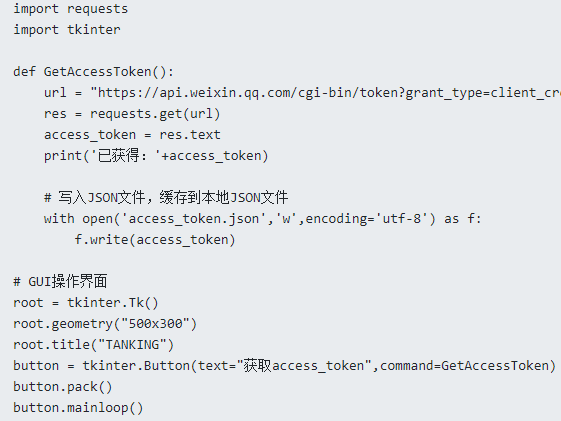 使用Python调用微信小程序获取access_token接口以获取请求凭据。为了方便操作,这里结合了Python内置的GUI库Tkinter。